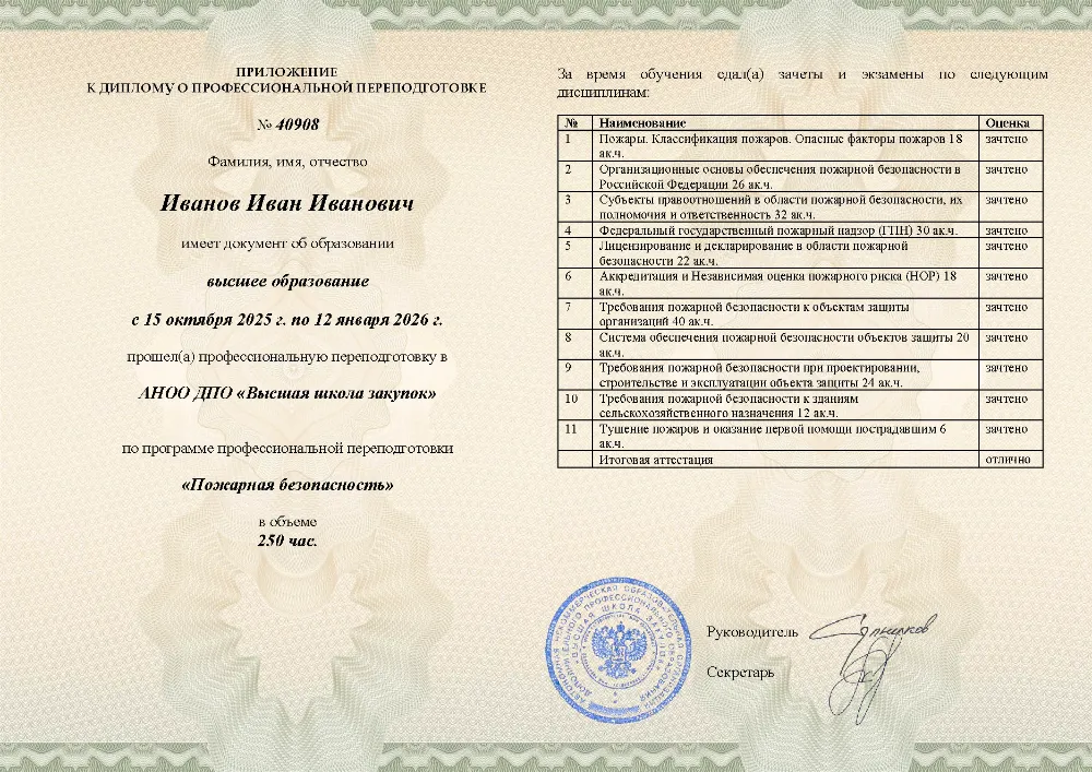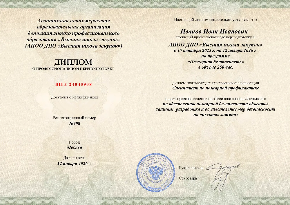 Профессиональная переподготовка, 250 академических часов, 11 модулей: организационные основы и законодательство в области пожарной безопасности, лицензирование и надзор, требования к объектам защиты, проектирование, тушение пожаров и оказание первой помощи пострадавшим. Онлайн-обучение в в Улан-Удэ с итоговой аттестацией.