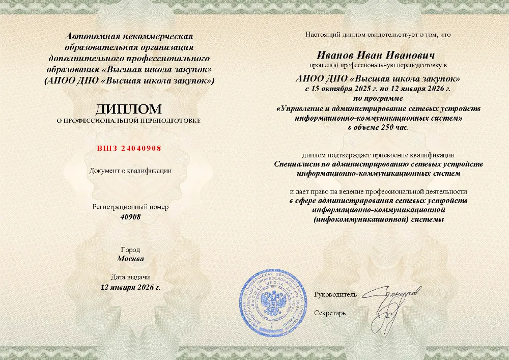 Профессиональная переподготовка, 250 академических часов, 9 модулей: нормативно-правовое регулирование и ввод в эксплуатацию, настройка и мониторинг сетевых устройств, управление доступом и безопасностью, диагностика и восстановление работоспособности инфокоммуникационных систем. Онлайн-обучение в в Улан-Удэ с итоговой аттестацией.